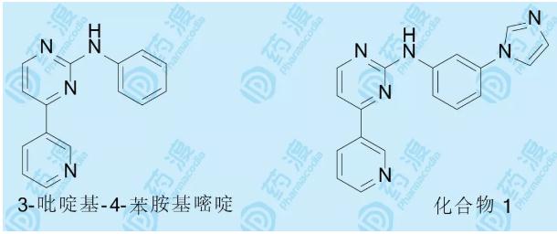 美国的氰胺公司(Cyanamid)为了研制抗炎、抗过敏和哮喘药物,合成了一系列具有3-吡啶基-4-苯胺基嘧啶骨架的衍生物,其中最高活性的化合物1对人嗜碱性细胞的抑制活性高达0.3 μmol·L-1,但是选择性比较差。