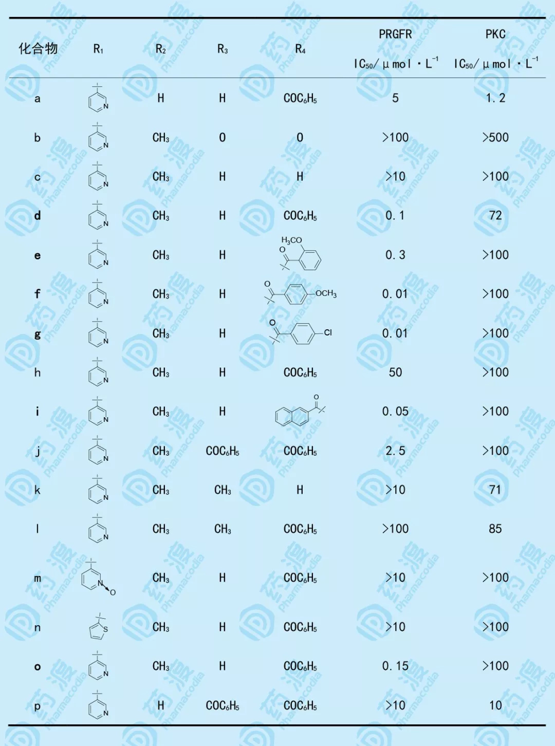 PKC属于丝氨酸/苏氨酸激酶可催化ATP对丝/苏氨酸残基磷酸化;PDGFR属于酪氨酸激酶, 催化酪氨酸残基的磷酸化。PDGFR和PKC激酶虽然都是激酶, 但不在一个家族, 却都高表达于一些肿瘤和成纤维细胞异常密切相关, 遂以研发抗CML病为目标, 以化合物1为先导物进行结构变换。上表仅列出了化合物对PDGFR与PKC激酶的活性值。从中可以看出,在6位引入甲基后,选择性显着提高;其次吡啶环和苯甲酰胺片段对PDGFR结合很重要;另外,嘧啶与苯基之间的NH是重要的链接基团。故化合物d、e、f、g、i、o是PDGFR选择性强效抑制剂,是比较理想的潜在药物。