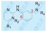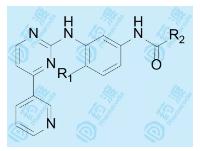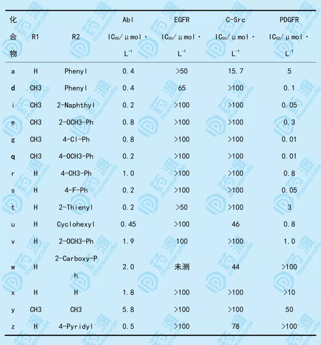前面的构效关系研究显示,虽然都是与ATP结合位点相结合,但对酪氨酸激酶与丝/苏氨酸激酶抑制活性相差很大,说明活性部位的氨基酸残基的变动,显示出选择性作用, 导致对PDGFR与PKC激酶的活性差异。但由此可引申到苯胺基嘧啶化合物可能对慢性粒细胞白血病的高表达蛋白Abl激酶有活性, 因为Abl属于酪氨酸激酶家族,从而开展了作用于双靶标药物的研究。为了能获得具有Abl和PDGFR双重抑制活性的衍生物,研发人员在前期研究的基础上,进行了第二轮的构效关系研究。