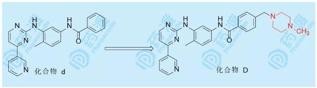 体外实验检测得衍生物d和q对Abl和PDGFR具有较强的双重抑制活性,但是对小鼠CML细胞研究发现,并未呈现出较好的生物活性,其主要原因是这类衍生物的水溶性比较差,亲脂性过强导致的,研究人员于是在其苯环上引入亲水性较强的基团。结果发现,在苯环上通过将亚甲基与N-甲基哌嗪片段链接在一起后得到的化合物D,不仅避免了N-甲基哌嗪与苯环直接连接在一起可能会导致的代谢毒性外,而且也提高了衍生物对细胞水平的抑制活性,且存在一定的浓度-效应关系。