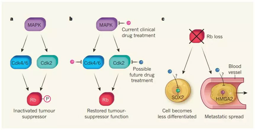 CDK4和CDK6抑制剂的成功表明控制RB活性可以阻止癌症进展。不过,这类疗法耐药性的出现正推动着一类新药的开发,这类药物的作用是模拟RB功能的重新激活。此外,为了对抗缺失RB的癌细胞,科学家们需要寻找新的靶点。此次,Walter等成功鉴定出了RB缺失的分子和细胞效应(如细胞去分化、MAPK信号通路上调缺失),这将有助于相关工作的开展。