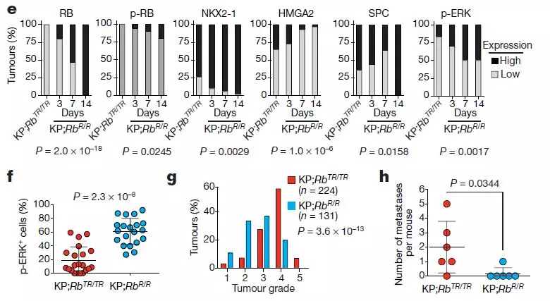 基于以上发现以及先前的一些研究,Walter等进一步调查了在删除RB编码基因几个月后恢复肺癌小鼠中RB的表达所带来的影响。结果显示,RB的重新表达促进了未分化癌细胞的再分化,从而降低了肿瘤的恶性程度(图2)。这一发现非常重要,因为,它意味着,重新激活RB或操纵RB下游蛋白的策略可能会对治疗已丧失RB表达的癌症有益。