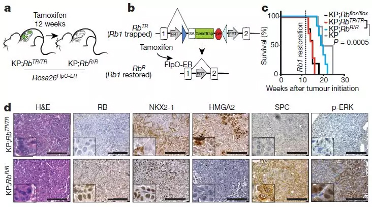 5月1日,来自美国宾夕法尼亚大学的科学家团队在Nature杂志上[1]发表了一项具有重要启示意义的成果。论文报道了研究人员对肿瘤抑制因子蛋白RB(retinoblastoma)的分析。利用一个实验性系统,David M. Walter等能够控制该蛋白在肺癌小鼠中的缺失和重新激活。