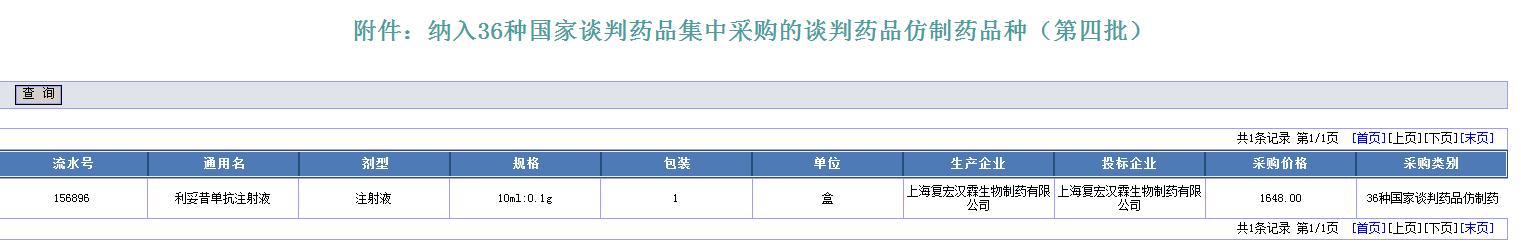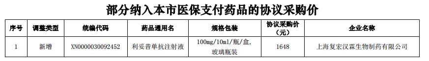 近日,上海市医药集中招标采购事务管理所发布“(2019)31号关于公布部分药品纳入本市医保支付后协议采购价的通知”,通知显示,根据《关于印发<上海市基本医疗保险、工伤保险和生育保险药品目录(2017年版)>的通知》和《关于落实人社部谈判药品仿制药纳入<上海市基本医疗保险、工伤保险和生育保险药品目录(2017年版)>有关事项的通知》的文件规定,将上海复宏汉霖生物制药有限公司研制的利妥昔单抗注射液(商品名汉利康)纳入本市医保支付药品的协议采购价,采购价为1648元(100mg/10ml/瓶),自2019年5月15日起执行。