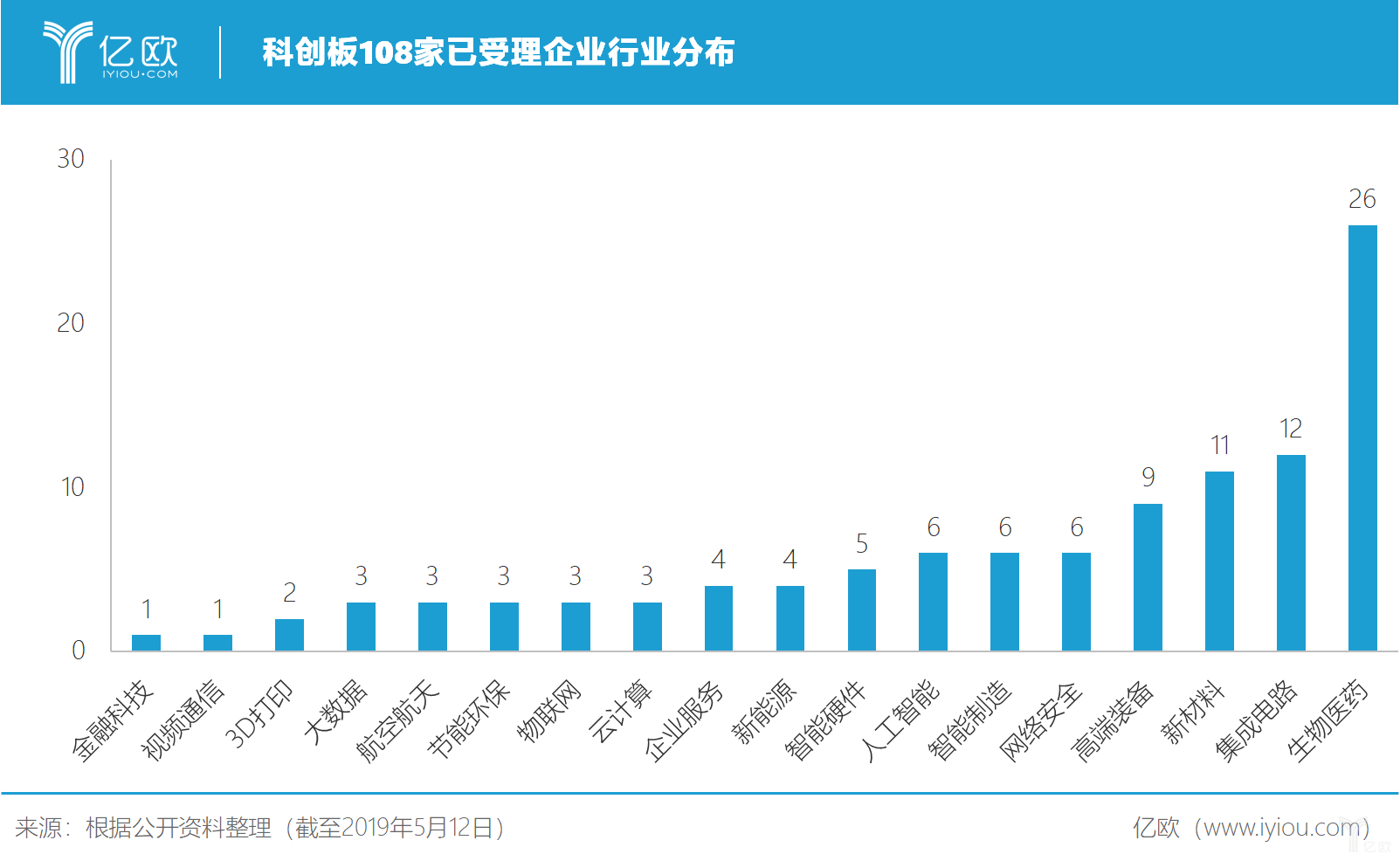 亿欧对108家企业所属行业进行了更精细的划分,共有18个行业,包括生物医药、集成电路、智能制造、高端装备等。从行业来看,生物医药行业企业最多26家,其次为集成电路12家,新材料行业第三共11家。