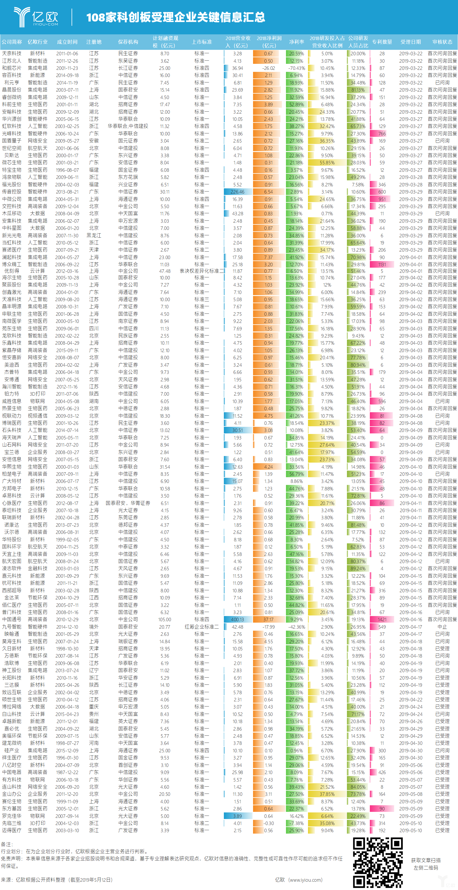 108家科创板受理企业核心数据整理如下表所示: