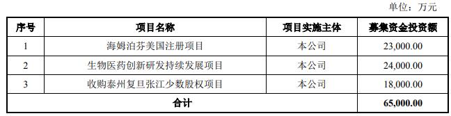 招股书申报稿显示,复旦张江拟公开发行不超过12000万股,占发行后总股本比例不超过11.51%,募集资金不超过6.5亿元,主要投向海姆泊芬美国注册项目、生物医药创新研发持续发展项目以及收购泰州复旦张江少数股权项目。