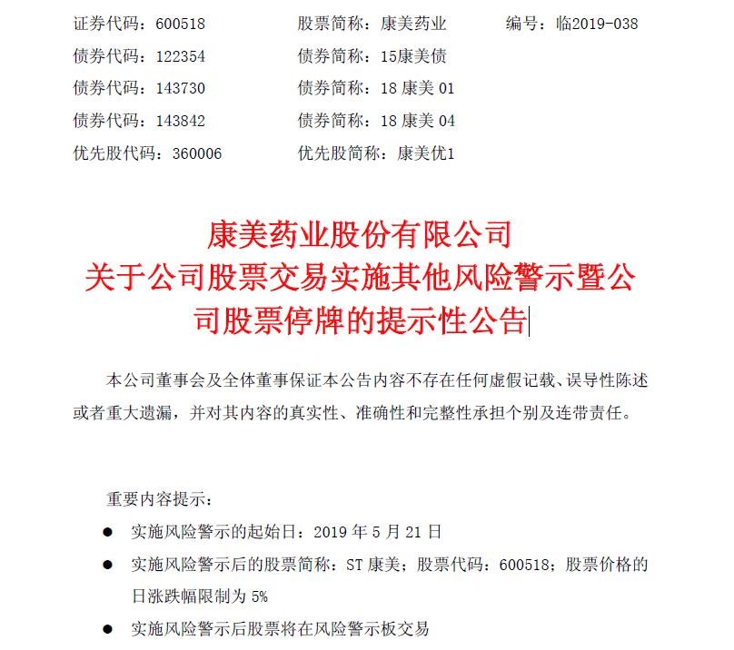 另值得注意的是,在证监会发布公告当日晚间,康美药业发布《关于公司股票交易实施其他风险警示暨公司股票停牌的提示性公告》称,公司与相关关联公司存在88.79亿元的资金往来,该等资金被相关关联公司用于购买公司股票,行为触及《上海证券交易所股票上市规则》13.1.1条规定“投资者难以判断公司前景,投资者权益可能受到损害”的情形。公司股票申请5月20日停牌1天,将于5月21日恢复交易,并实施其他风险警示,股票简称变更为ST康美。