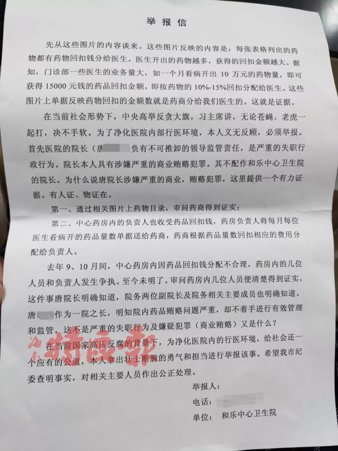 在举报信中,华生还称去年9月份因为利益分配问题,和乐中心卫生院中心药房内的几名工作人员还曾与药房负责人发生过争执,并称对于收回扣事件,医院院长唐某负有不可推卸的领导监管责任,是严重的失职行为,院长本人涉嫌商业贿赂,对乱象不作为,之所以举报这件事,是为了净化卫生院的行医环境。