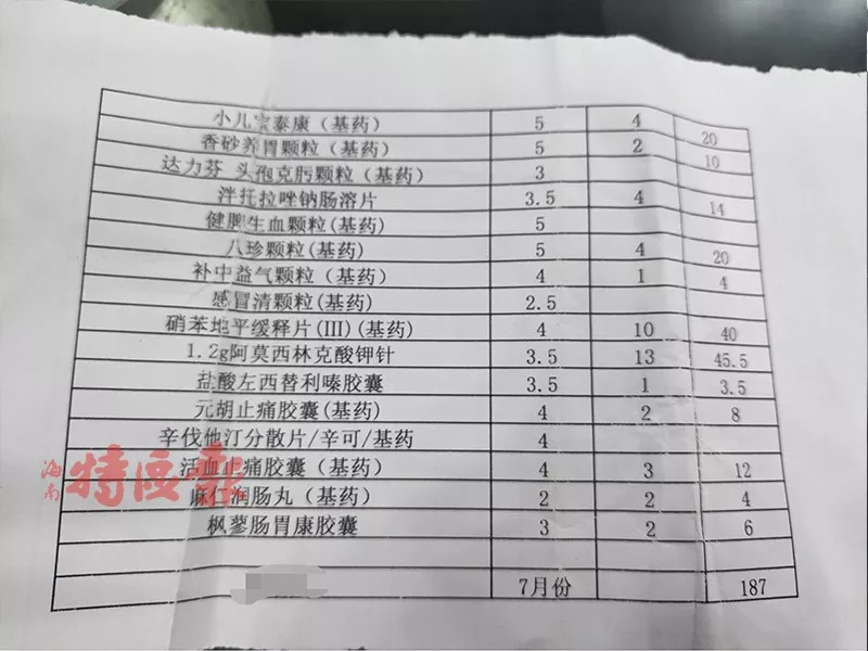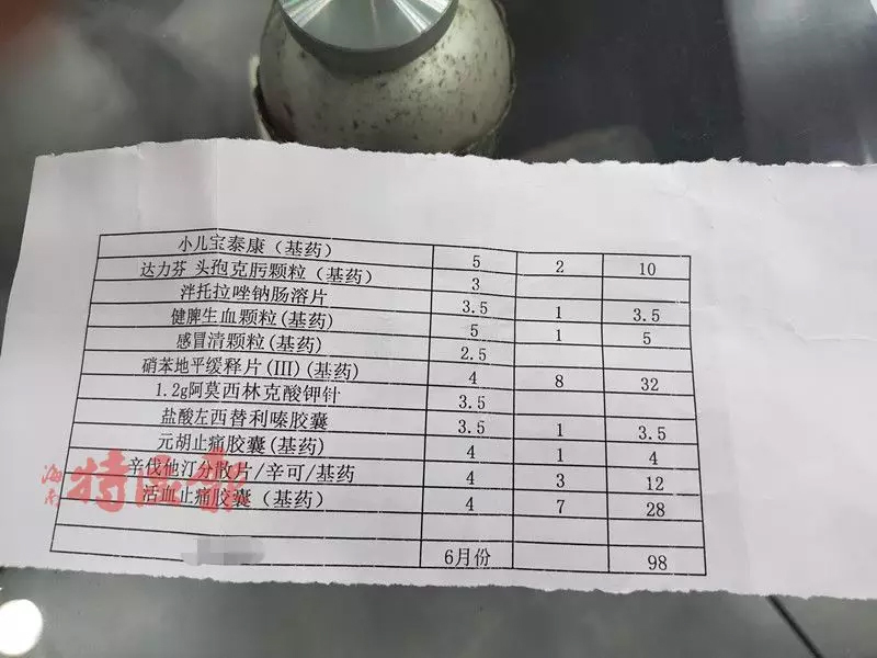 “这张是去年6月份的回扣单,单子的金额是98元;这张是去年7月份的回扣单,单子金额是187元。”华生具体解释道,“第一列是药品名称,比如这款‘小儿宝泰康(基药)’,给患者开一盒这样的药,医生就能拿5元的回扣,也就是表格第二列的数字‘5’,第三列的数字2则代表数量。去年6月份,这种药我开了两盒,按照5元/盒的标准,我可以拿到10元的回扣,也就是最后一列的数字10。再比如这款‘活血止痛胶囊’,第二列数字4代表提成标准是4元/盒,第三列数字7代表这个月总共开了7盒,第四列数字28就是当月拿到的回扣28元。”
