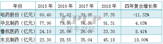 但是据同行可比的公司来看,华北制药、鲁抗医药和东北制药这三家公司和哈药股份的产品布局类似。可这三家公司的业绩均没有出现连续下滑迹象,且四年复合增长率均为正。
