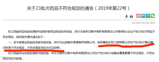 5月10日,国家药监局公布的关于23批次药品不符合规定的通告中,哈药股份子公司–哈药集团生物工程有限公司生产的2批次紫杉醇注射液有规定目视条件下观察的粒径大于50微米的不可溶性物质,即可见异物不符合规定。