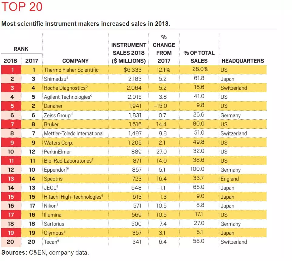 今年3月份,C&EN杂志公布了“2018年度全球分析和生命科学仪器制造商TOP20”名单,尚未有1家总部在中国的企业入选。