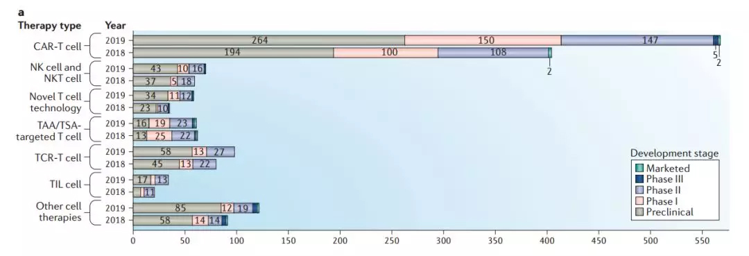 综述的最后,作者们也指出了他们的担忧。尽管细胞疗法的蓬勃发展有望带来更多治疗患者的创新疗法,但不能否认,目前的管线中存在许多“重复性工作”。靶向CD19的CAR-T疗法,或许会带来冗余。