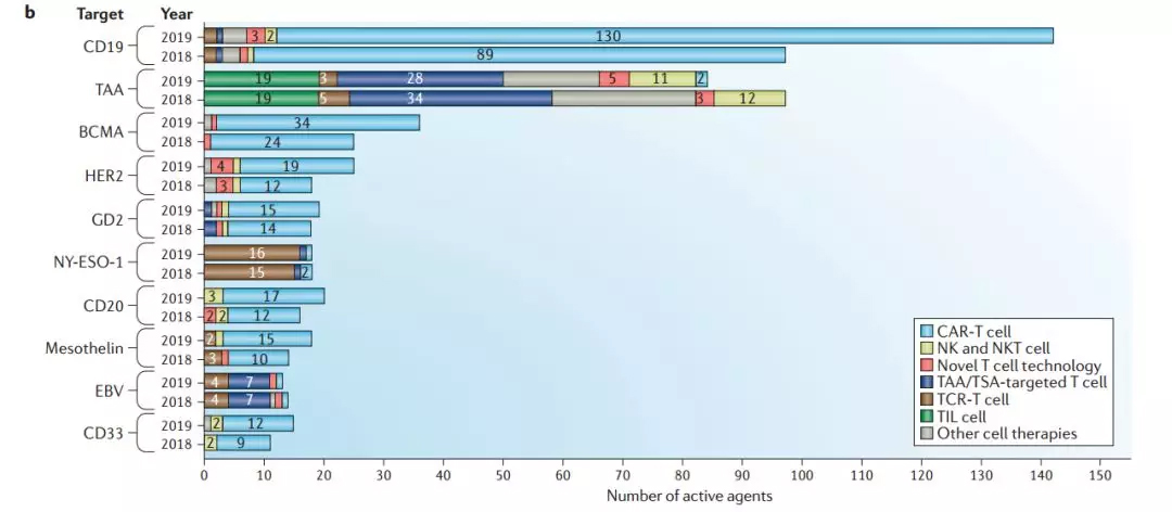 在去年的一项分析中,CD19就是细胞疗法管线中最热的靶点。今年,它蝉联榜首,再次成为最受欢迎的靶点——据统计,目前共有142款疗法针对的是这一靶点,其中有130款CAR-T疗法。