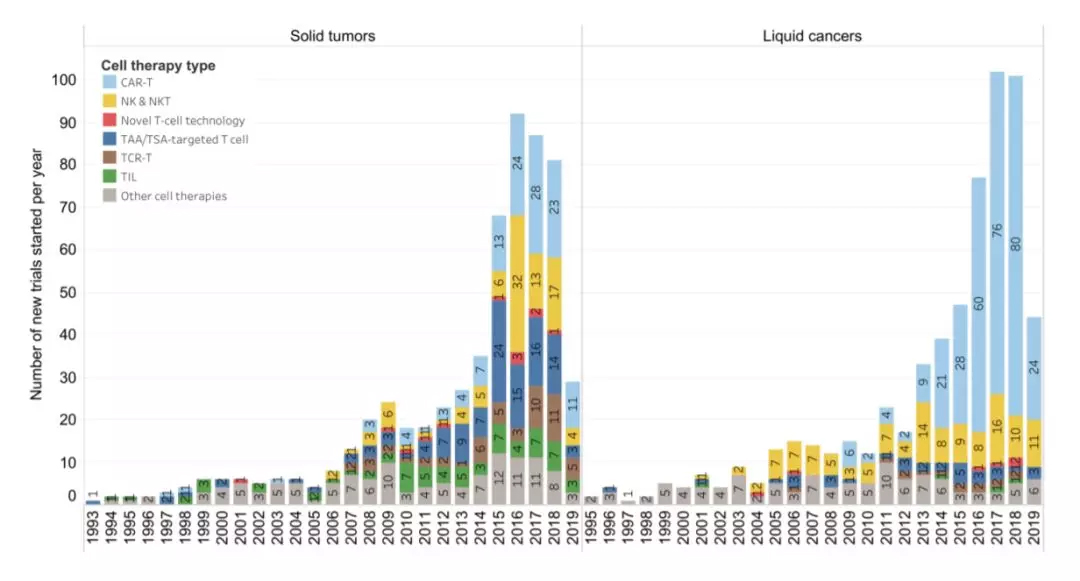 在本综述的收尾部分,作者们讨论了细胞疗法治疗实体肿瘤的前景。目前来看,全球范围内大约90%的癌症病例为实体肿瘤。然而自1993年以来,大约只有一半的细胞疗法临床试验针对实体肿瘤展开,其中又有不少临床试验集中于黑色素瘤、中枢神经系统肿瘤、以及肝癌上。换句话说,目前的细胞疗法并不能很好地针对许多实体肿瘤类型。