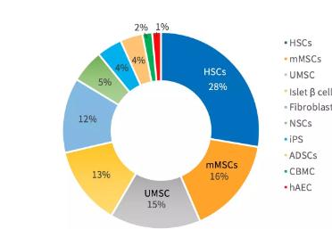在干细胞治疗细胞种类选择上,骨髓造血干细胞(HSCs)、骨髓间充质干细胞(mMSCs)、脐带间充质干细胞(UMSC)、胰岛β细胞(Islet βcells)和成纤维细胞(Fibroblast)是临床试验细胞的主要来源。