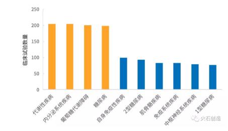 在疾病治疗领域,代谢性疾病、内分泌系统疾病、葡萄糖代谢障碍、糖尿病是目前研究最受关注的四个领域,四者临床试验数量较为接近,均突破200例。自身免疫性疾病、2型糖尿病、肌骨骼疾病、免疫系统疾病、中枢神经系统疾病、1型糖尿病的研究数量也已突破百例,关注度获得持续提高。