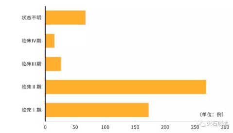 全球正在进行的干细胞研究大多处于临床早期。其中临床Ⅱ期试验数量最多,有268例;其次为Ⅰ期,有172例。随着试验进入后期,数量迅速减少。从数据上看,Ⅲ期临床试验数量不到30例,Ⅳ期临床试验数量不足20例。见图4。