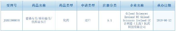6月12日,国家药品监督管理局药品审评中心官网显示,吉利德的丙肝药“索磷布韦/维帕他韦/伏西瑞韦片”(Vosevi)在中国的上市申请获得承办,受理号为JXHS1900078。
