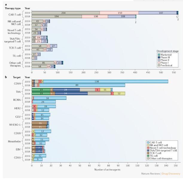 近日,美国癌症研究所(CRI)在《自然》发表文章,对癌症领域细胞疗法的发展趋势进行了分析,包括最新研发管线和临床试验数量方面的动态变化,并将2019年3月的调查结果与2018年3月的调查结果进行了对比。