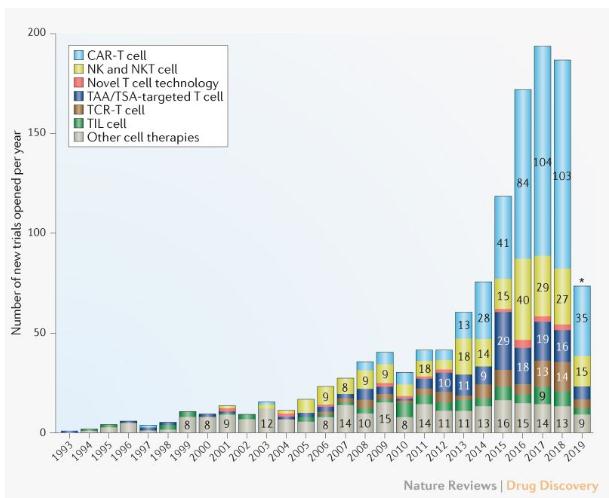 利用数据库,CRI研究人员确定了从1993年到2019年3月已开展的1216项癌症细胞疗法试验。数据表明,在过去的十年里,每年都有增加大量新的试验,主要是由于CAR-T疗法的试验激增。