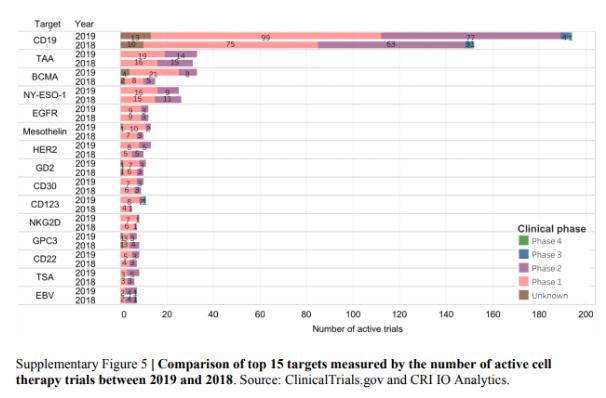 数据还显示,过去一年共有188项新试验启动,92项试验停止(active),表明了这一领域的动态变化。在所分析的临床试验评估的靶点中,正如前述管线中总体情况,CD19仍然是最热门的靶点。