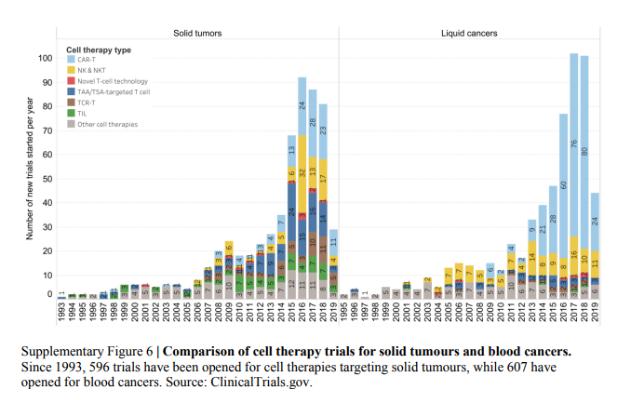 尽管全球约90%的癌症发病率是由实体瘤引起的,但自1993年以来启动的所有细胞疗法试验(1203项试验中的596项)中,只有大约一半是针对实体瘤。