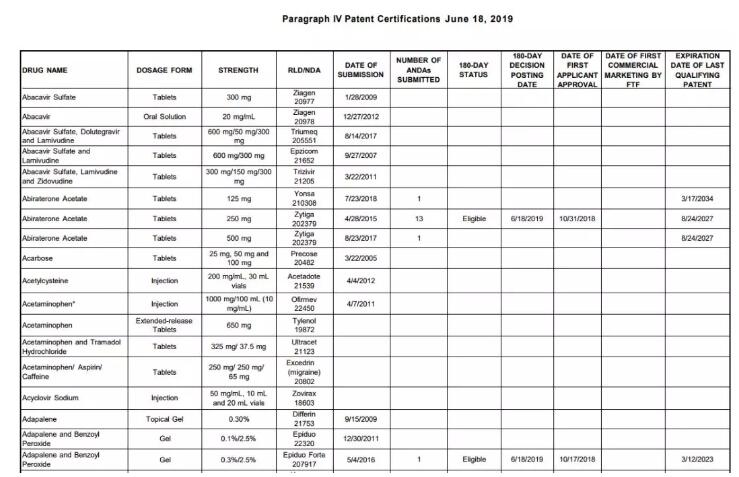 此前,P IV专利挑战案例提供的信息非常有限,只有药品名字(剂型、规格)以及第一个包含有P IV挑战声明的完整ANDA的提交日期。不过经常就会漏掉比这个ANDA更早的有可能获得180天独占期的仿制药申请。