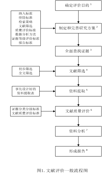 8.形成文献评价报告。文献评价报告应当说明是基于何种级别的证据所获得的结论,同时说明结果的外推性。证据分级标准参见附录(四)。撰写文献评价报告可参考系统综述/Meta分析优先报告的条目(Preferred Reporting Items for Systematic reviews and Meta-Analyses, PRISMA)、流行病学观察性研究的Meta分析(Meta-analysis Of Observational Studies in Epidemiology,MOOSE),PRISMA声明和MOOSE声明参见附录(五)。