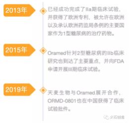 以色列企业Oramed医药公司的口服胰岛素ORMD-0801临床试验进展情况见图1。其实,Oramed公司与中国拥有更早的渊源,早在2014年中恒集团旗下广西梧州制药集团股份有限公司就对其进行了投资。2015年发布公告,计划对其进一步增资,但仅过了4天就终止了向Oramed增资和购买ORMD-0801许可权的意向协议,一旦ORMD-0801在中国获批,这次决定也最终将使天麦生物成为赢家。