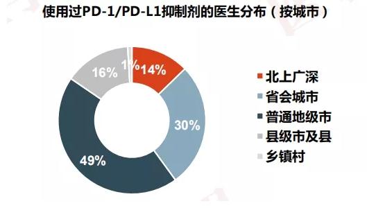 “医学界调研”发现,在所有使用过PD-1/PD-L1抑制剂的医生群体中,有近50%分布于普通地市级,其次为省会城市(30%),再次之为县级市及县(16%)。