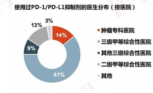 PD-1/PD-L1抑制剂的使用医生绝对数最大的是三甲医院,占比高达61%,其次为肿瘤专科医院和其他三级医院