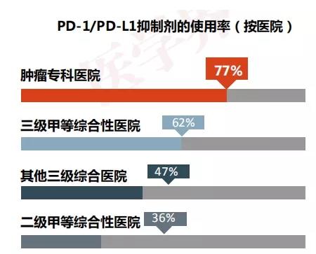 PD-1/PD-L1抑制剂使用率最高的为肿瘤专科医院,高达77%,其次为三甲医院、其他三级医院以及二甲医院