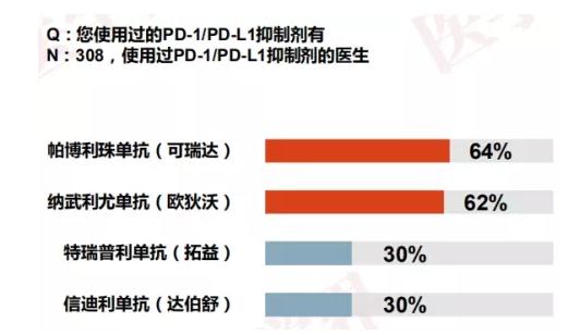 “医学界调研”数据显示,所有PD-1/PD-L1抑制剂中,“O”药和“K”药的使用率最高,均超过6成,而国产新药使用率平均不足3成。