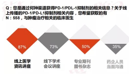 数据显示,超过70%的医生是通过线上、线下医学讲座资讯来获取PD-1/PD-L1抑制剂的相关信息的,事实上,线上获取医学知识已经成为现在的知识获取途径的主流方式。