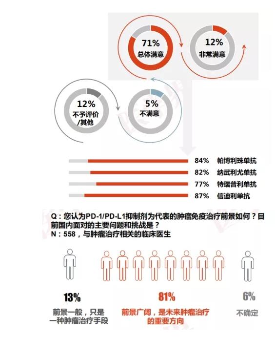 “医学界调研”数据显示,71%的医生表示对PD-1/PD-L1抑制剂的实际疗效与已公布的临床研究结果相当或更优表示总体满意,非常满意的有12%,不予评价的占比12%,不满意的仅为5%。