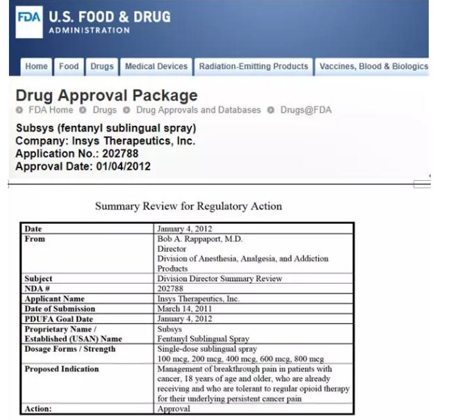 无论是刑事调查还是民事调查,都因Insys支付回扣以及其他与销售Subsys相关的非法营销行为,及其产生的严重后果。2012年,美国食品和药物管理局(FDA)批准Subsys用于治疗突发性疼痛的癌症患者。但该制药厂商贿赂医生,让他们向无需服用此药的患者开处方或者对没有癌症的病患也开了Subsys的处方。
