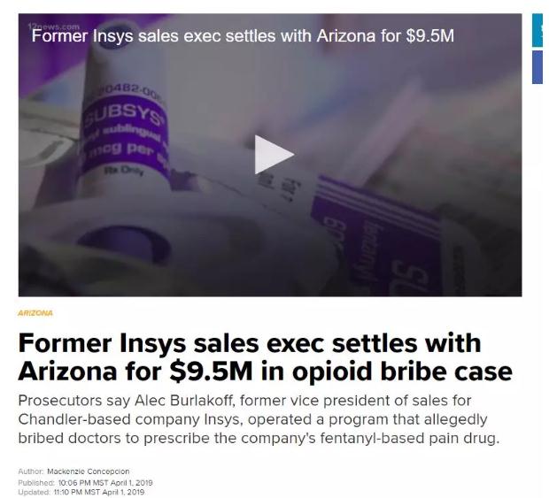 2019年4月,前销售副总裁Alec Burlakoff同意向亚利桑那州司法部长Mark Brnovich支付亚利桑那州950万美元的民事赔偿金。Brnovich指控Burlakoff实施一项向医生支付回报丰厚的“演讲费”计划,以鼓励医生开出更多的芬太尼止痛药处方。Burlakoff必须向该州支付所获收益520万美元,以及430万美元的民事罚款。作为和解协议的一部分,Burlakoff同意成为Insys案件的证人,并将永久禁止在亚利桑那州做广告或销售任何药品。