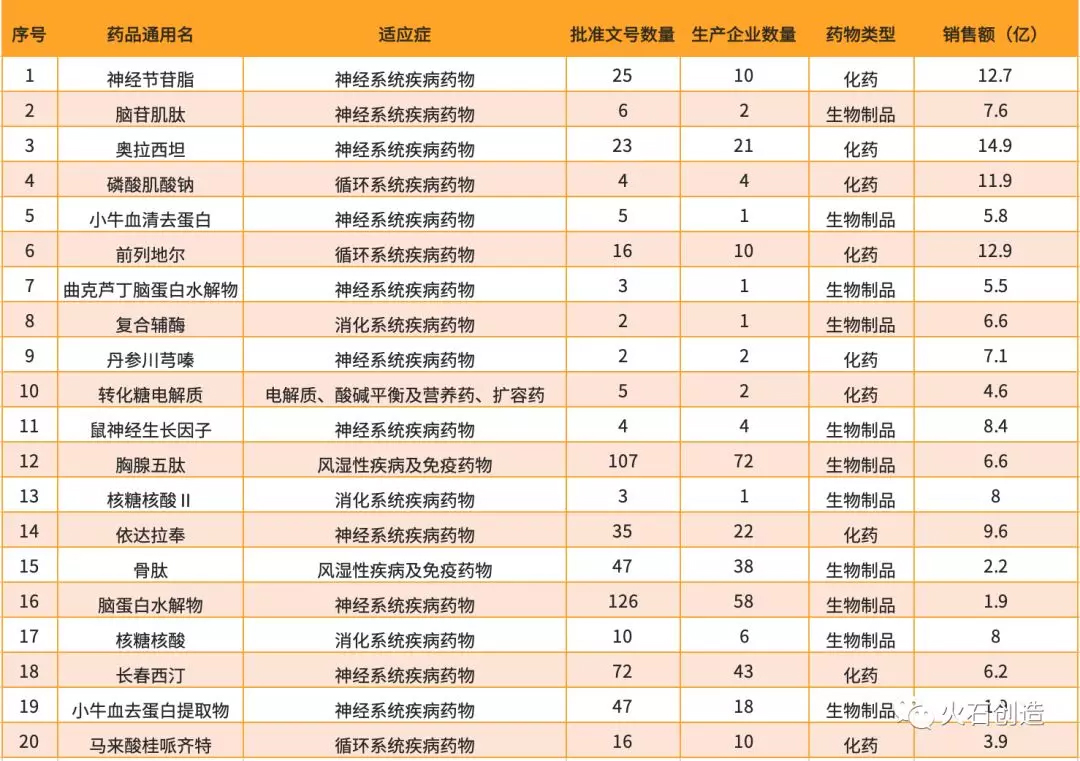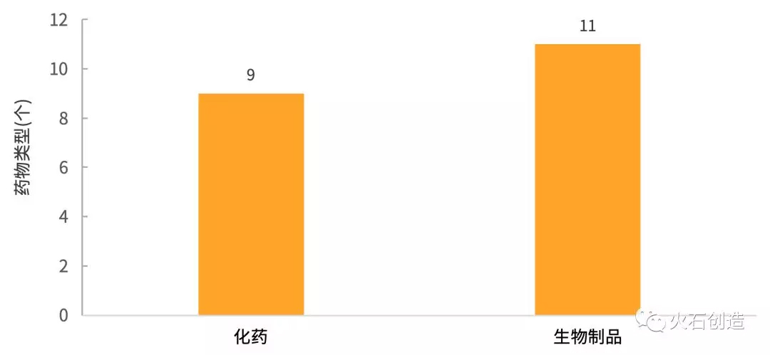 从药物类型来看,第一批国家重点监控合理用药药品目录中的药物包含生物制品和化药两大类,分别为11个和9个;其中生物制品主要包括核酸、蛋白提取物、多肽和蛋白水解物等类型。