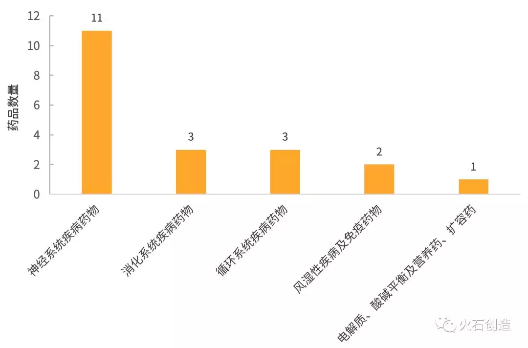 从适应证来看,第一批国家重点监控合理用药药品目录中的药物品种用于神经系统、消化系统和循环系统等方面的治疗,其中神经系统疾病治疗药物11个,占比50%以上。