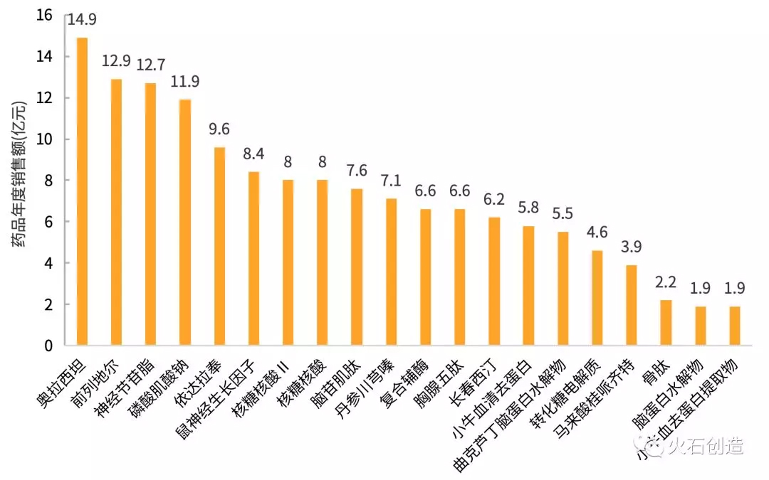 从样本医院销售额来看,第一批国家重点监控合理用药药品目录中的药物销售额差异较大。其中,最高的奥拉西坦,年度销售额为14.9亿元;最低的小牛血去蛋白提取物,年度销售额为1.9亿元。20个药品平均年度销售额为7.3亿元。