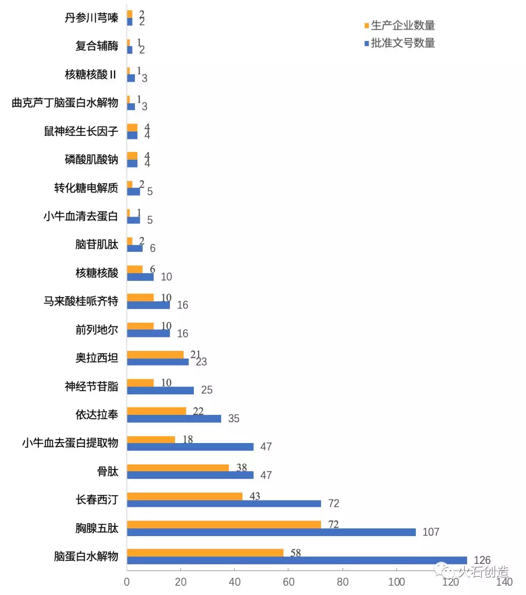 从批准文号数量和生产企业数量来看,第一批国家重点监控合理用药药品目录中的药物呈两级分化的态势。脑蛋白水解物、胸腺五肽、长春西汀批准文号数量位列前三位,分别为126、107和72件;三者在全国范围内的生产企业数量也位列前三位,分别为58、72和43家。然而,丹参川穹嗪、复合辅酶、核糖核酸II批准文号数量分别为2、2和3件,全国范围内的生产企业也仅有一两家,波及的企业数量较少。