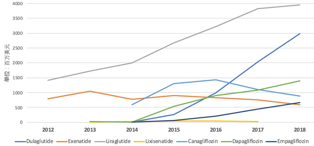 图1. 能改善主要不良心血管事件(MACE)降糖药的全球销售额