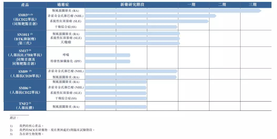 招股书称,SM03是全球同类靶点中首款及唯一一款用于治疗RA的CD22单抗药物,有别于其他治疗类风湿关节炎的常规生物制品(例如TNF-α、IL-6、IL17及CD20为靶向的单克隆抗体)。SM03目前在中国进行RA适应症的III期临床试验,该公司计划将于2019年年底前完成受试患者的招募。