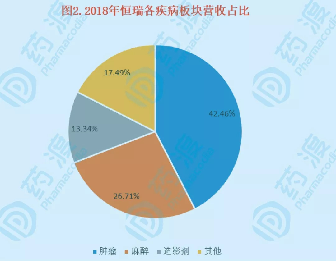 恒瑞在当时国内心血管市场大行其道的仿制时代,目光长远选择了肿瘤、造影剂、麻醉三个特殊疾病领域,不仅规避了其他药企的竞争外,还布局了未来的市场蓝海。2018年恒瑞年营收174.18亿元,肿瘤板块营收73.95亿元,成为了公司的支柱;凭借碘克沙醇注射液、碘佛醇注射液的优异成绩,在国内造影剂市场和扬子江等药企分庭抗礼;麻醉市场贡献了46.53亿元,呈现稳步上升的趋势。
