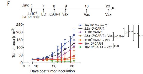 抗癌疫苗极大提高了CAR-T疗法的效果。在最高剂量组(绿色),肿瘤体积显着缩小(图片来源:参考资料[1])