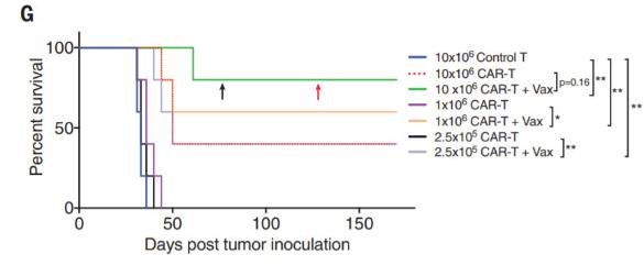 快速扩增的大量CAR-T细胞就好像一支浩浩荡荡的抗癌大军,在许多小鼠体内将肿瘤“清除得干干净净”(complete elimination)。更可喜的是,这些肿瘤涵盖了多种不同的类型,包括胶质母细胞瘤、乳腺癌、以及黑色素瘤。据分析,抗癌疫苗与CAR-T疗法的组合,能在60%的小鼠中清除肿瘤。而如果只是用CAR-T疗法,就没有这样的效果。