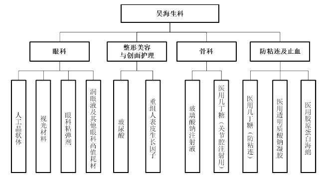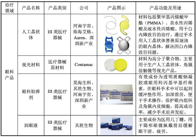 根据招股书,昊海生物是一家应用医用材料技术和基因工程技术进行医疗器械和药品研发、生产和销售的公司,产品包括人工晶状体系列、医用透明质酸/玻璃酸钠系列、医用几丁糖系列、医用胶原蛋白海绵系列,主要应用于眼科、整形美容与创面护理(以下简称医美)、骨科、防粘连及止血(以下简称外科)四大板块。
