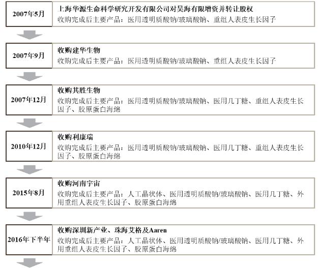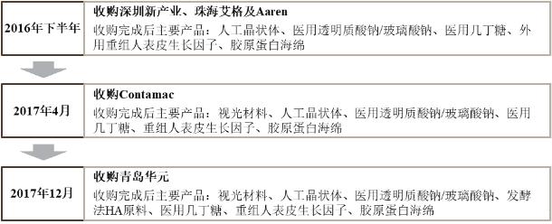 2016年10月,昊海生物花费3058.2万元完成对河南宇宙100%股权的收购;2016年12月,花费7000万元收购珠海艾格100%股权;2016年11月,花费3.6亿元收购Lenstec人工晶状体产品的中国独家经销商深圳新产业60%股权;2017年5月,又花费2.16亿元收购全球最大的独立视光材料生厂商contamac。